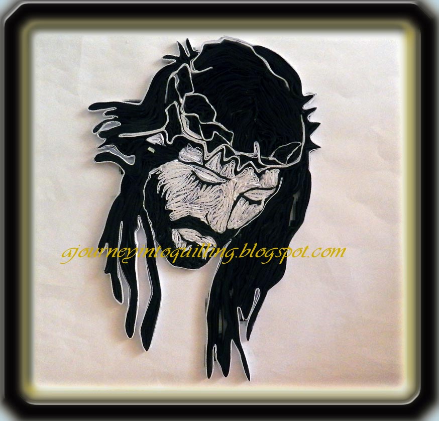 This quilled picture portrait of Jesus Christ on the cross reminds me of his last words. " into thy hands I commit my spirit". This complements and completes the series of 3 other Christ's portraits I have done which relate to the passion .